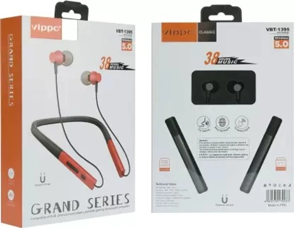 VIPPO VBT-1395 GRAND SERIES 38 Hours Playtime Magnetic storage wireless Neckband Bluetooth Headset (Grey, In the Ear)
